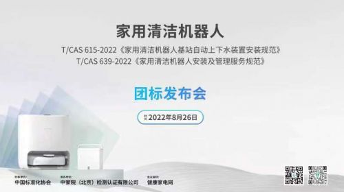 2022年8月26日,由中国标准化协会指导,中家院(北京)检测认证有限公司承办,健康家电网会议支持,“家用清洁机器人实现自动上下水的安装及服务规范团...