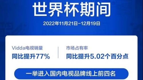 近日,根据奥维数据,世界杯期间(2022年11月21日-12月19日)海信旗下年轻品牌Vidda借力“大屏看球”强需求场景,实现快速增长,一举进入国内电视品牌...