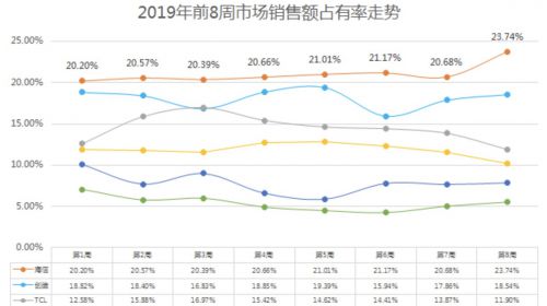 2019年开年,海信电视逆势而上,中怡康统计数据,今年开年以来,海信电视的周销售额占有率连续8周超过20%,第八周的销售额占有率高达23.74%,领先优...