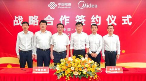 中国联通政企客户事业群常务副总裁冯华骏与美的集团副总裁兼楼宇科技事业部总裁管金伟代表双方签署战略合作协议,中国联通副总经理梁宝俊、中国联通广...