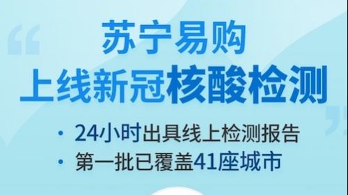 4月23日,苏宁易购联手爱康,上线新冠核酸检测预约服务。消费者线上预约,在选定地点采样后,24小时内可获得检测报告。首批覆盖41座城市,除北上广深一...